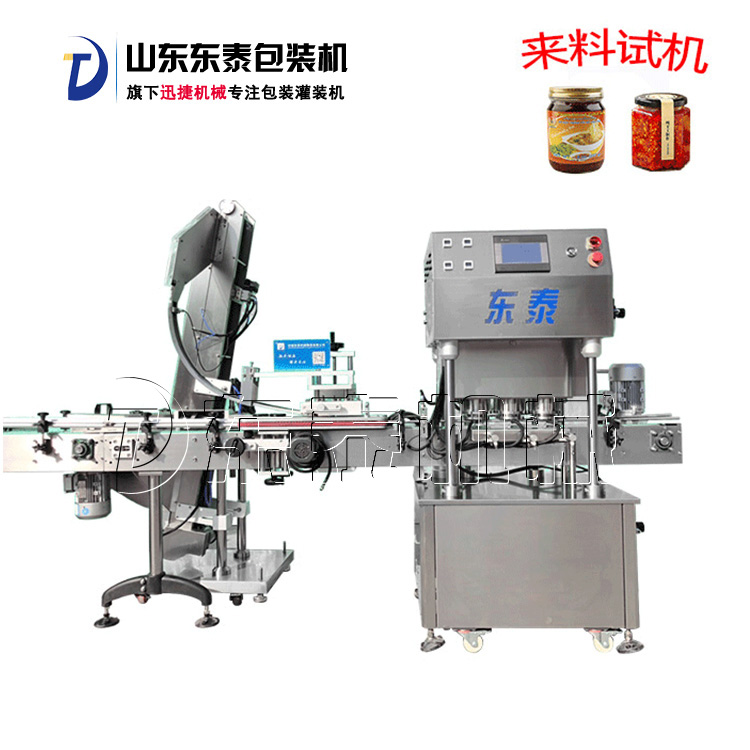 該直線式真空旋蓋機是東泰機械結合用戶使用情況,摒棄了傳統轉盤式真空旋蓋機的弊端,研制開發的新型高效設備,設備自動檢測到兩個瓶子蓋子進入到雙頭真空旋蓋機內,旋蓋機彩色顯示屏會實時顯示旋蓋狀況,整機多點檢測,當進口無瓶無蓋、出口堵塞、定位不準、瓶身傾倒均自動停機。單個旋蓋頭達到的真空度都可以單獨顯示,單獨調整。合格
