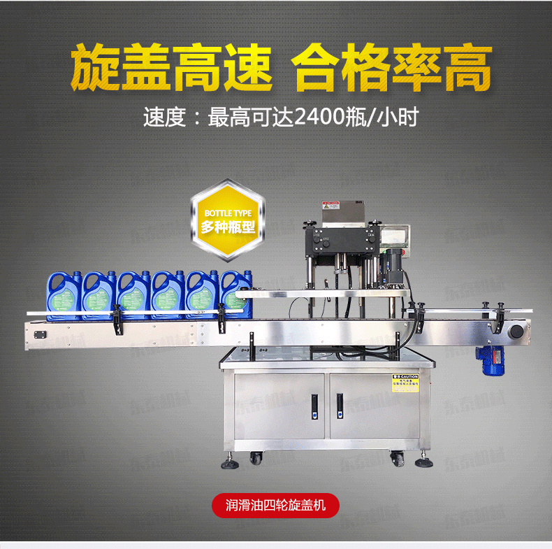 機油自動搓蓋機電氣控制運動,穩定性強;  設有定位裝置,旋蓋標準,操作方便;  鎖蓋范圍寬,可鎖不同形狀規格的瓶蓋;解決了噴頭、泵頭、噴霧泵、手扣式噴頭旋蓋難的