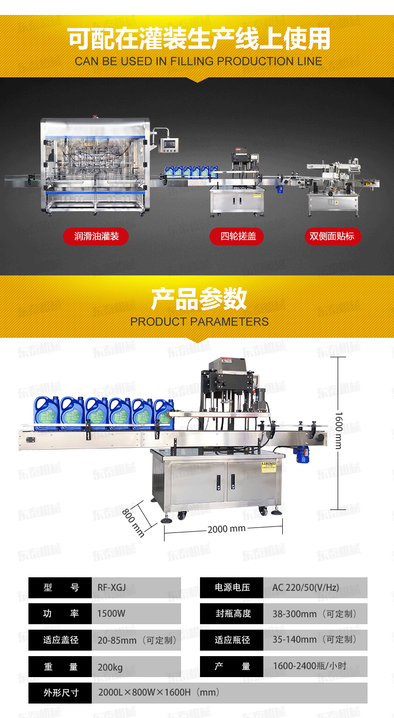 瓶、傳送、旋蓋,機器自動化程度高,穩定性好,調節方便,更換瓶形或蓋時無須備件,只需作調整即可完成(如配上蓋機,可進行自動上蓋)可以根據實際需要選配。