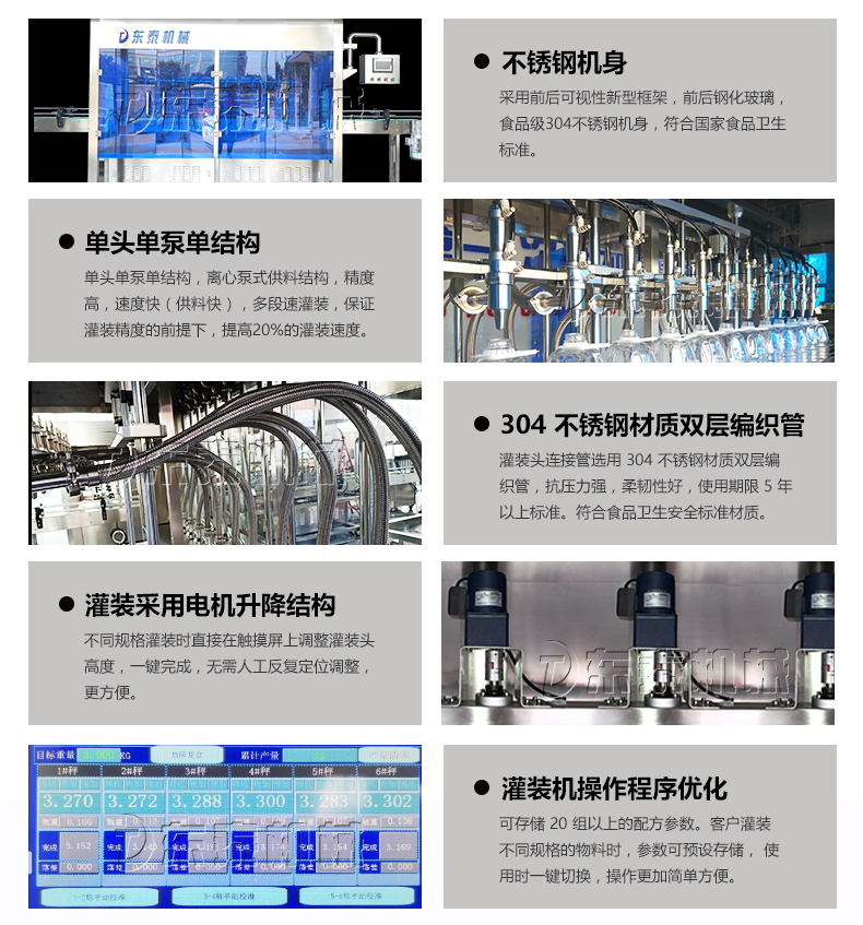 驅(qū)動方式更是通過伺服電機配合滾珠絲杠帶動相應(yīng)料缸內(nèi)的活塞做往復(fù)運動,從而讓料缸前腔產(chǎn)生負壓,以電機脈沖控制電機旋轉(zhuǎn)并控制活塞行程,從而調(diào)節(jié)灌裝量。驅(qū)動的方式應(yīng)用于容積柱塞式灌裝方式,這種灌裝方式和物料接觸部分均為不銹鋼316L 材質(zhì),灌裝過程中無污染,各物料轉(zhuǎn)換清洗方便,車間灌裝結(jié)束設(shè)備維護清洗便捷,大大優(yōu)于自流其他灌裝方式。氣缸驅(qū)動相比伺服驅(qū)動針對灌裝的計量范圍更加廣泛靈活,針對客戶多種灌裝規(guī)格的需求服驅(qū)動方式調(diào)整方便,僅需在觸摸屏上設(shè)置即可,一般出廠可以根據(jù)客戶常用規(guī)格直接寫入程序。伺服驅(qū)動方式灌裝速度快,不受氣壓的影響,灌裝速度可控??傊核欧?qū)動方式在操作使用、精度誤差、整機調(diào)整、設(shè)備清洗、維護保養(yǎng)等方面更加方便客戶使用。并且我們公司有著優(yōu)質(zhì)的售后服務(wù)團隊為您以后的使用保駕護航。