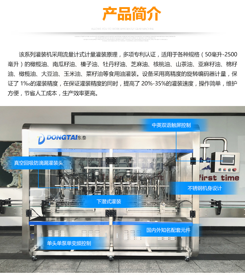 這款食用油灌裝機應用的是流量計式計量灌裝的原理,榮獲了多項認證資格,可適用各種容量(1-5升)的南瓜籽油、榛子油、牡丹籽油、芝麻油、核桃油、山茶油、亞麻籽油、棉籽油、橄欖油、大豆油、玉米油、菜籽油等多種食用油的灌裝。這個食用油選用了高精的旋轉編碼器計量,使灌裝精度保持在了1%o,在保證樂灌裝誤差的同時,提高了20%-35%的灌裝速率,使用方便,維護便捷,減少了一部分的人工成本,使生產效率提升。除了進桶時間,6頭灌裝機,變頻器在25赫茲的速率進行下,每組灌裝的時間為16秒,1350桶/小時;