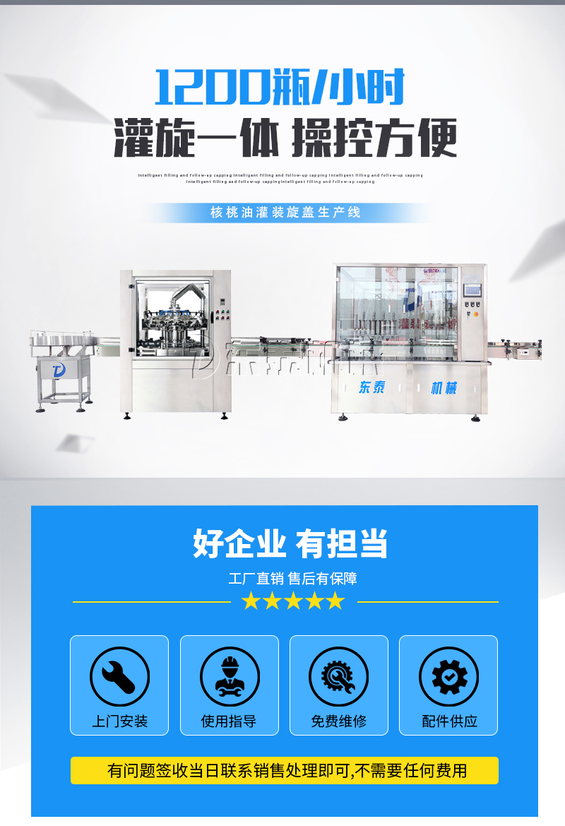 此橄欖油灌裝旋蓋機生產線是由灌裝、上外蓋、旋外蓋、PLC控制等主要部分組成。本機通過凸輪傳動,定位準確,傳動平穩,PLC自動控制灌裝、上蓋、旋蓋等全過程。并可配置全自動注塑機,由吹瓶直接進入灌裝系統,防止交叉感染,整個過程全部在無菌條件下完成,無需洗瓶和烘干。此灌裝旋蓋機適合于食用油、藥品等粘流體的灌裝生產。